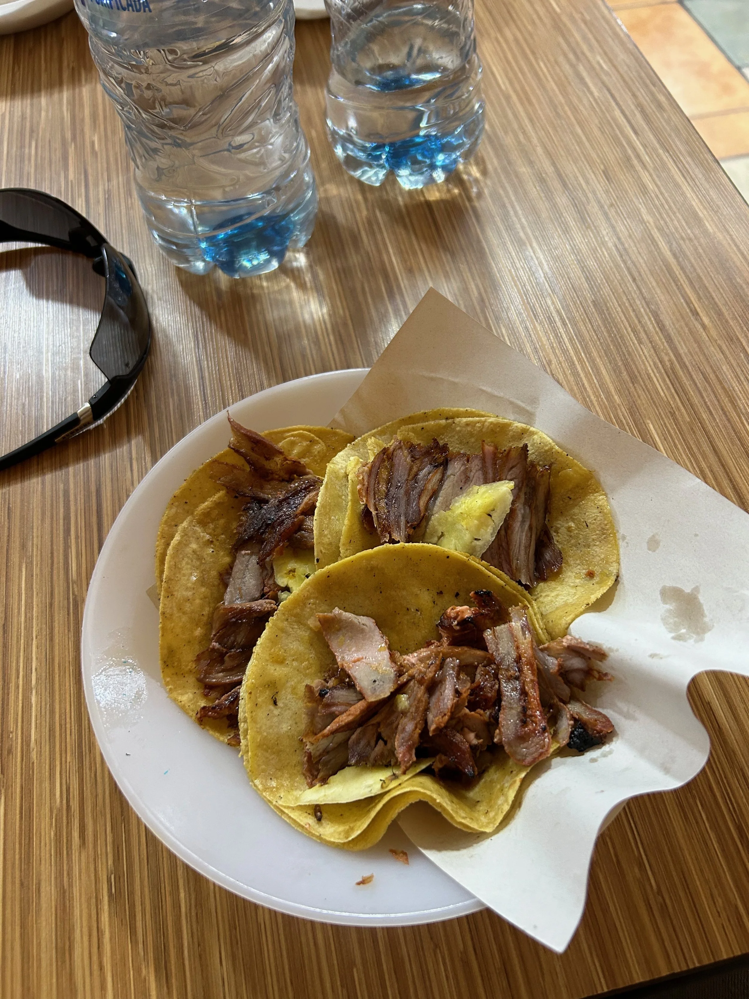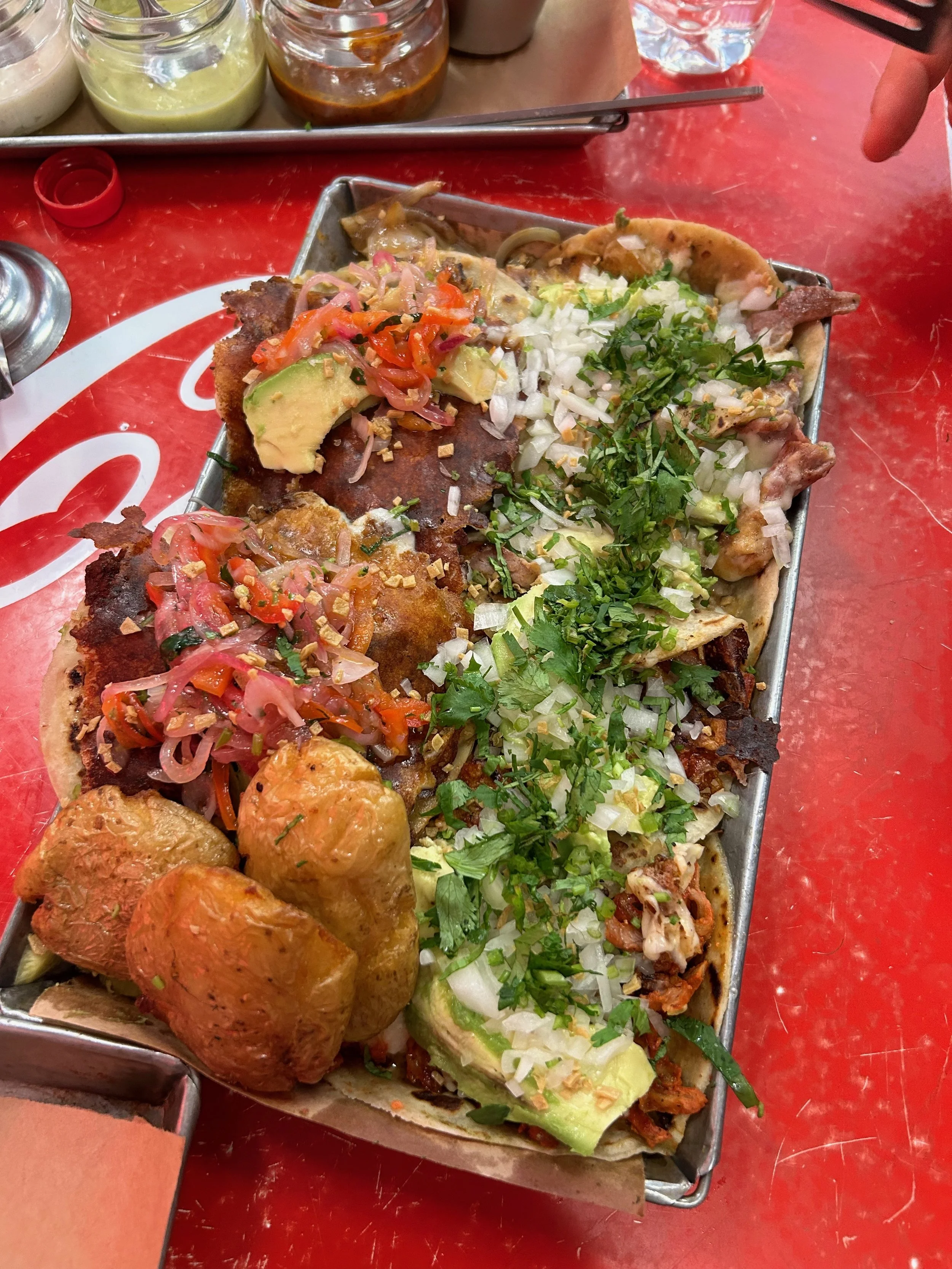 As soon as we landed and checked into the hotel, we went out in search of our first tacos of the trip. We made our way to Taquería Orinoco which has multiple locations across CDMX. We ordered so many tacos they had to bring us a tray. While a lot of the best Mexico City taco restaurants serve tacos with the traditional toppings of cilantro and onions, Taquería Orinoco goes all out. We had al pastor tacos piled high with avocado and cheese, chicharrón tacos with pickled onions and salsa as well as their version of fries - a side of roasted potatoes.