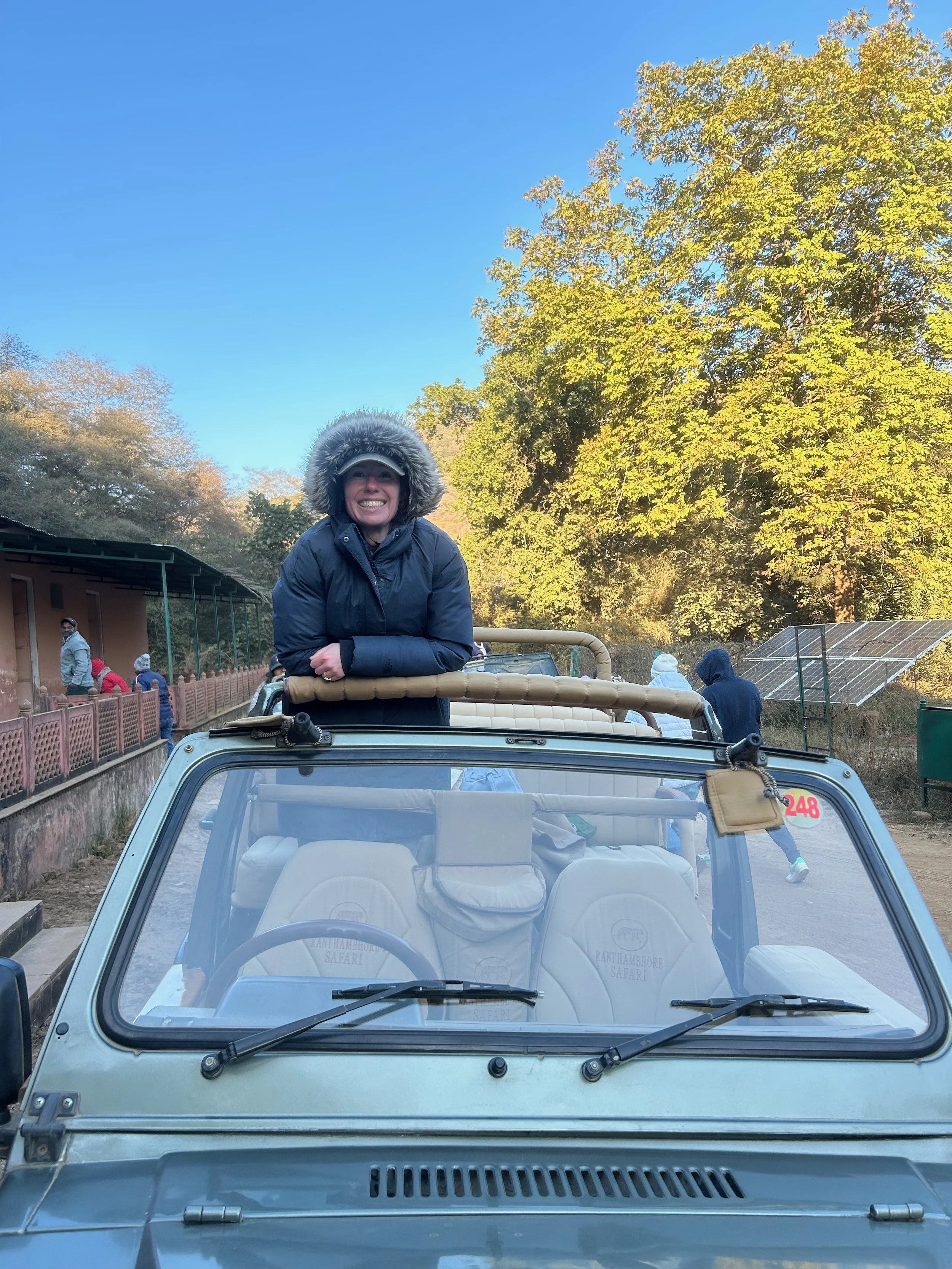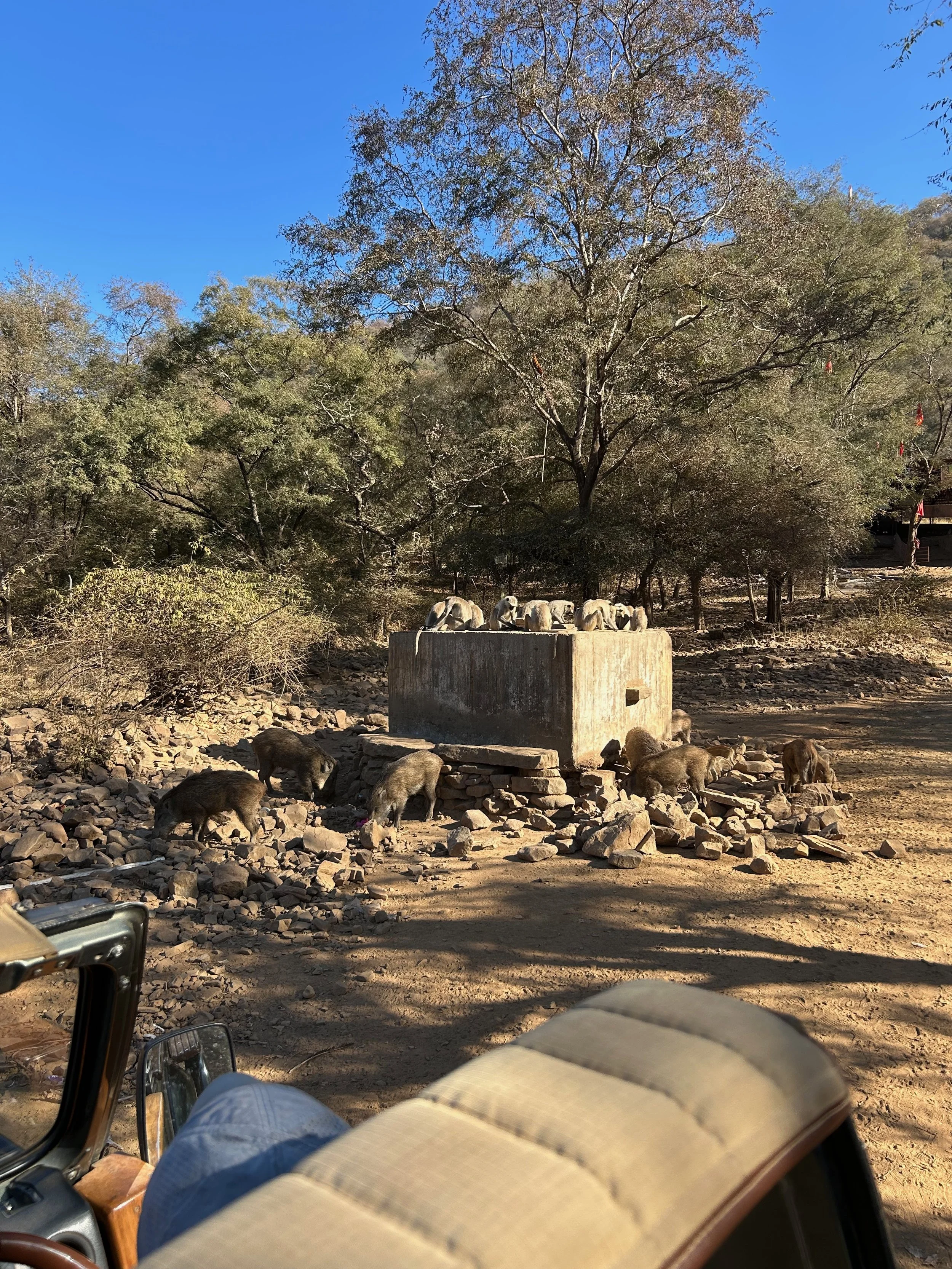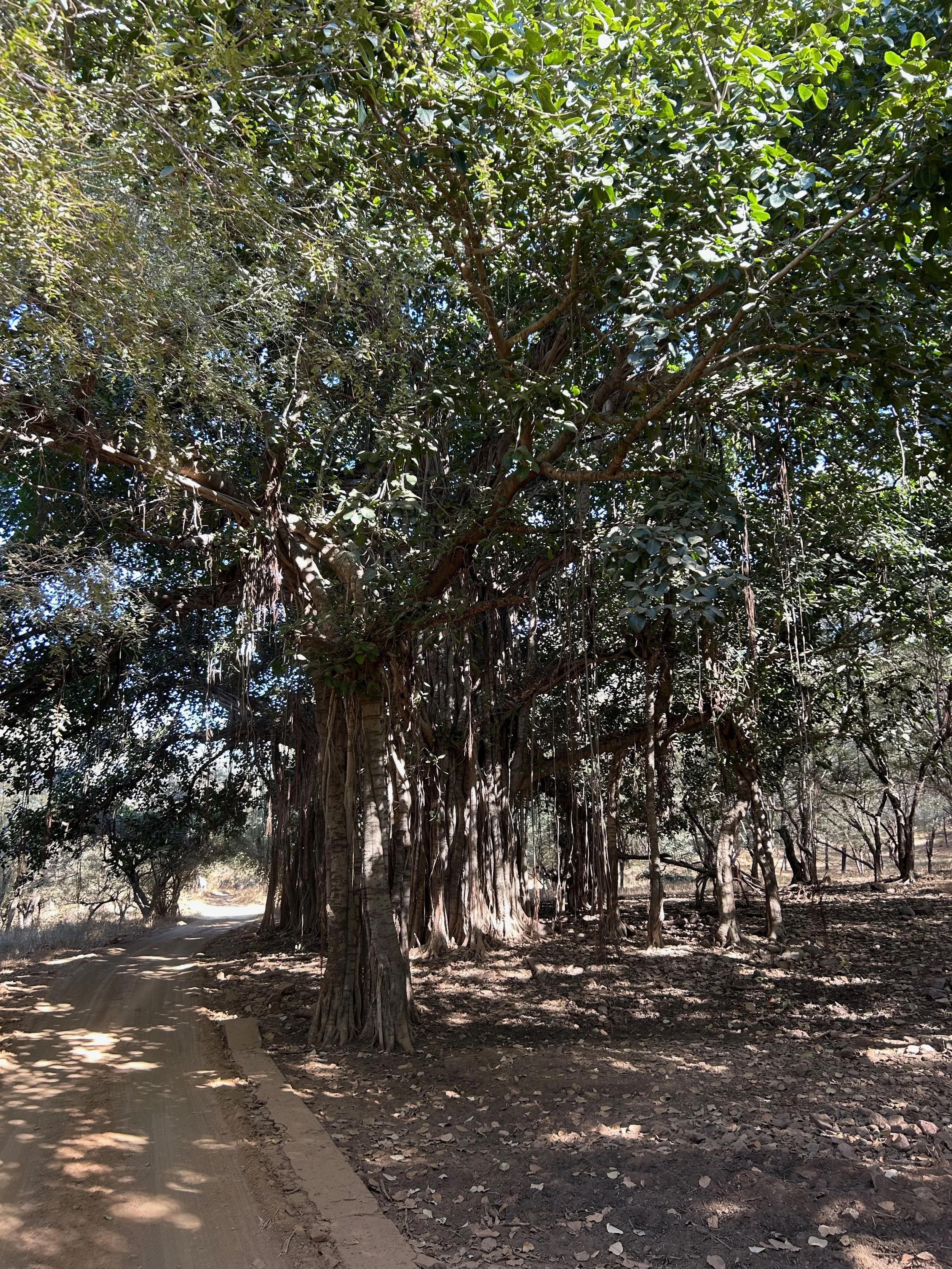 We were assigned a different zone for the afternoon, and we were treated to some of the park’s most beautiful scenery—shimmering lakes, rolling hills covered in native flora, and tall banyan trees. With the warmer afternoon temperatures, we were less bundled up and able to chat more easily with our guide. He told us about the history of the tigers in Ranthambore and the local community’s efforts to prevent poaching and protect both the tigers and the forest. We learned that tigers are extremely territorial and, once old enough, will even fight their own mothers and siblings to claim territory. That fact made me even more grateful that the tiger we encountered in the morning wasn’t interested in us at all.