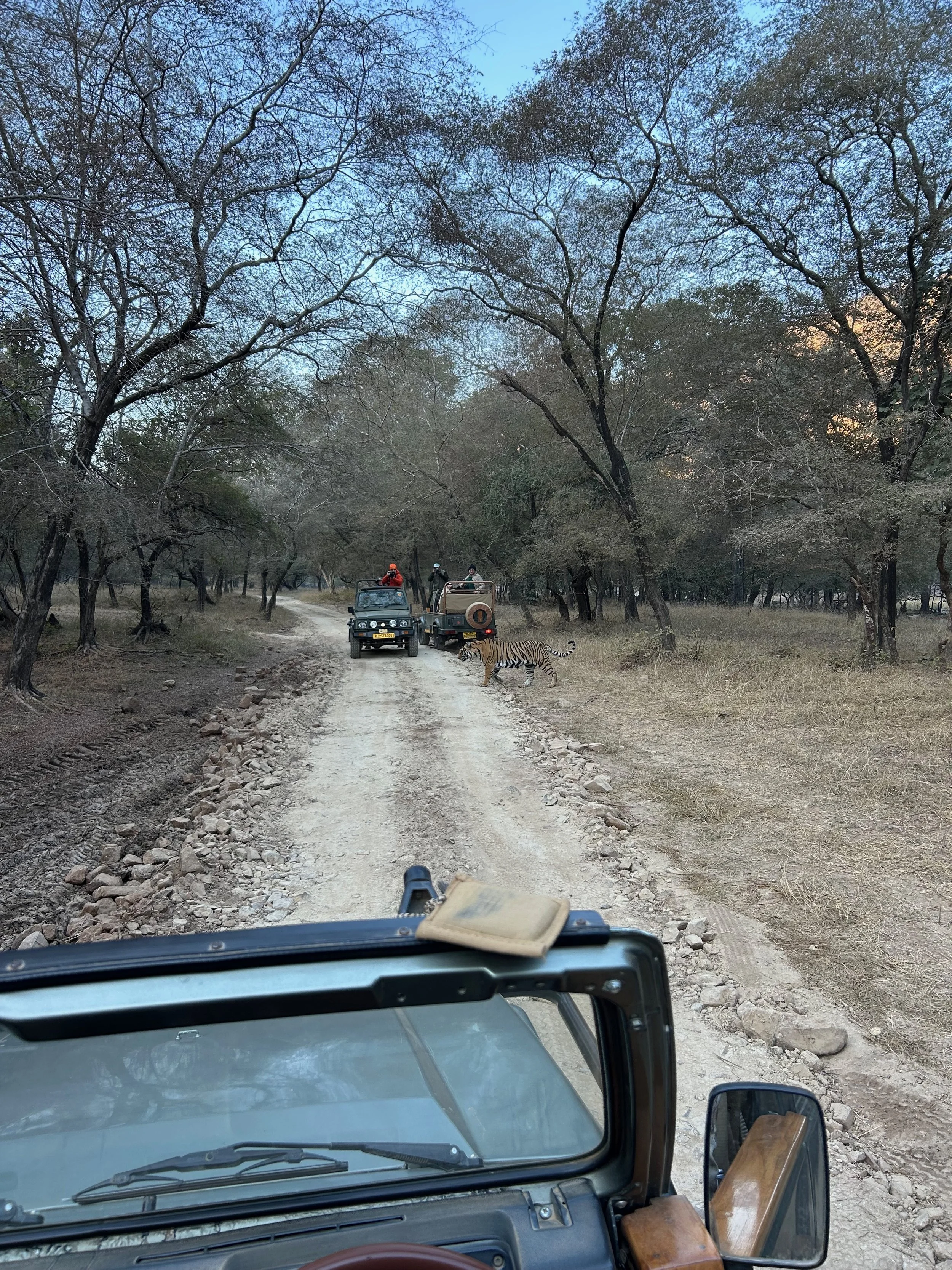 We watched in awe as she came closer and closer. She stalked into a clearing and walked right in front of our Jeep. It was an instant shot of adrenaline. We were thrilled to “see some action,” as our guide put it, but there was also something deeply humbling—and slightly terrifying—about being that close to a full-grown tiger in an uncovered vehicle. I estimated she was about 50 feet away, and the thought crossed my mind that if she decided to charge, there would be nothing stopping her. She moved slowly but powerfully, with the confidence of an apex predator, and eventually disappeared into the trees.